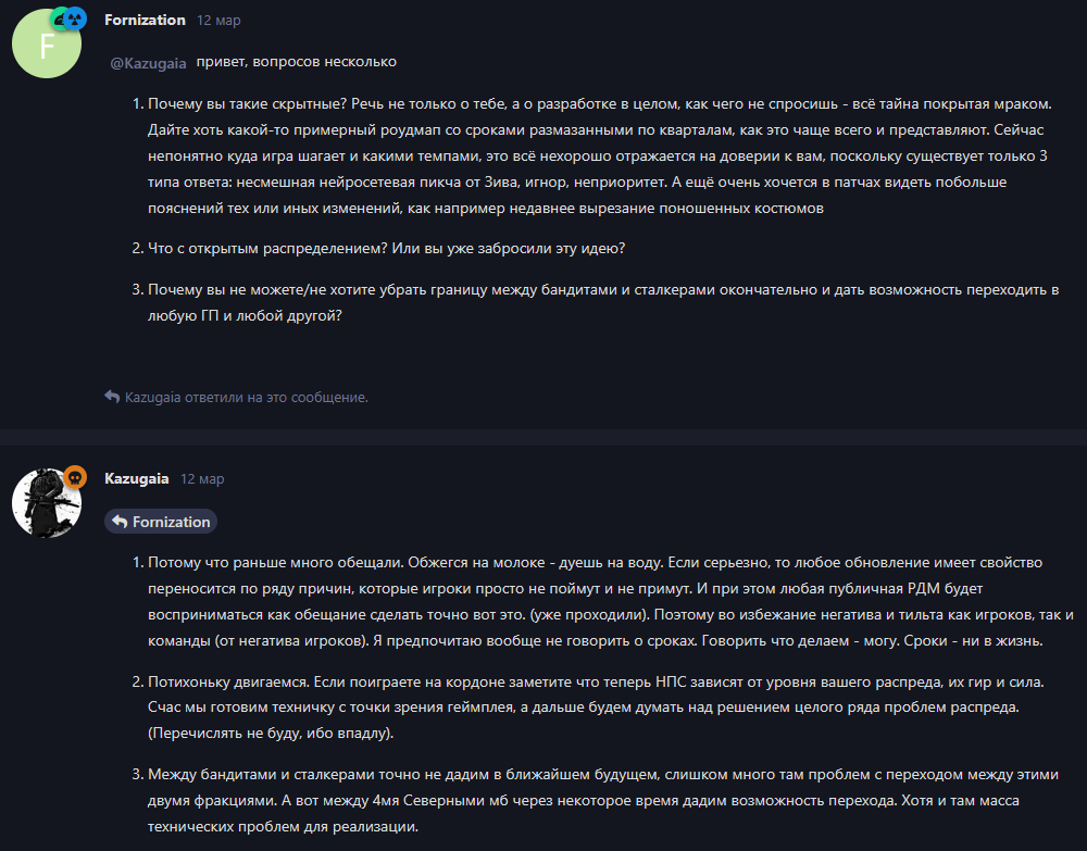 Здраствуйте, слушайте что там по межфраку или возможности переходить из сталкерских фракций в бандитские ? Просто такая ситуация что из-за это многим людям нужно делать твинк, когда на основе у них куча снаряжения, и спрашивается в чём проблема сделать такую возможность. допустим с части лора это не на что не влияет, как пример есть квест у завета где нужно завербовать пленённых из разных фракций. Я не разработчик поэтому не могу понять всей картины, но вроде эта не очень сложно реализуемая механика. И сколько ждать то ещё в итоге ?