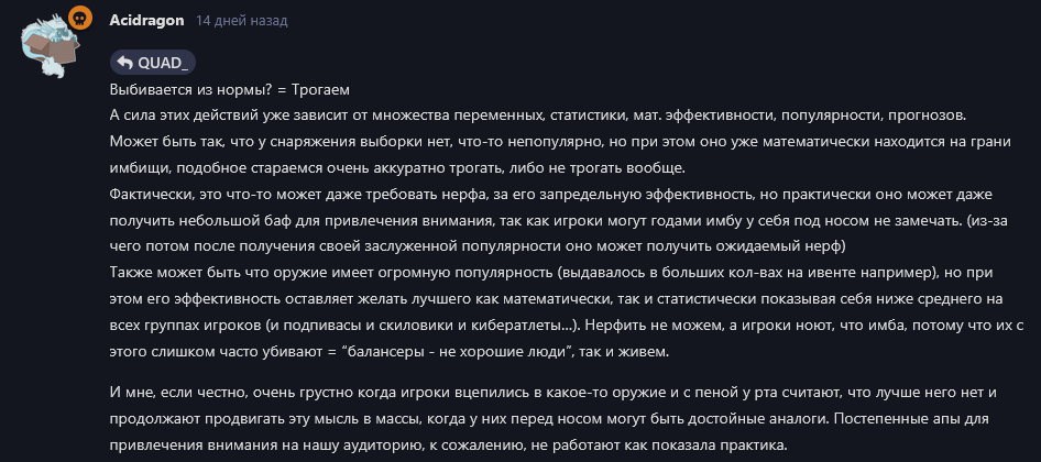 Vargasss “По нытью не балансим”. Именно эта фраза стала популярна последнее время, и всех кто пытается что-то донести до разработчиков называют нытиками. Они целенапревлено навесили на игроков этот ярлык, позволяющий им не реагировать на реальные запросы и проблемы.