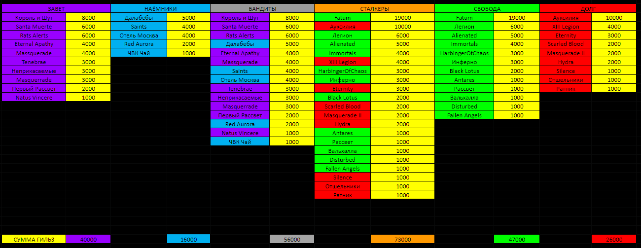 Porello Улучшил таблицу, сделал еще топ для бандитов и сталкеров, чтобы типы могли выбирать между банд \ сталкр кланами