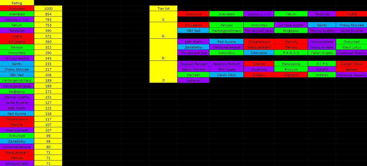 Porello Также была сделана новая система рейтинга с моим индивидуальным подсчетом + составлен tier list не по силе, а по шансу выигрыше в сетке. Чем левее и выше, тем шанс того, что эта группировка Вас выиграет - больше.